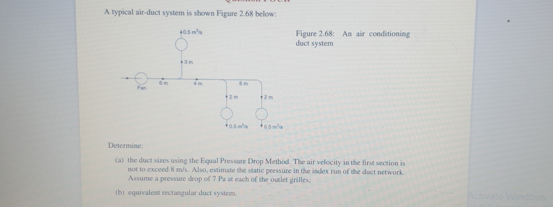 A typical air-duct system is shown Figure 2.68 below: Figure 2.68: An air conditioning duct system Determine: (a) the duct sizes using the Equal Pressure Drop Method. The air velocity in the first section is not to exceed
