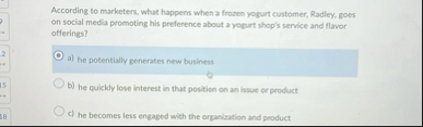 According to marketers, what happens when a frozen yogurt customer, Radley, goes on social media promoting his preference about a vogrt shop's service and flowor offerings? a) he potentially generates new business he quickly lose interest in that position on an issue or product c) he becomes less engaged with the organization and product