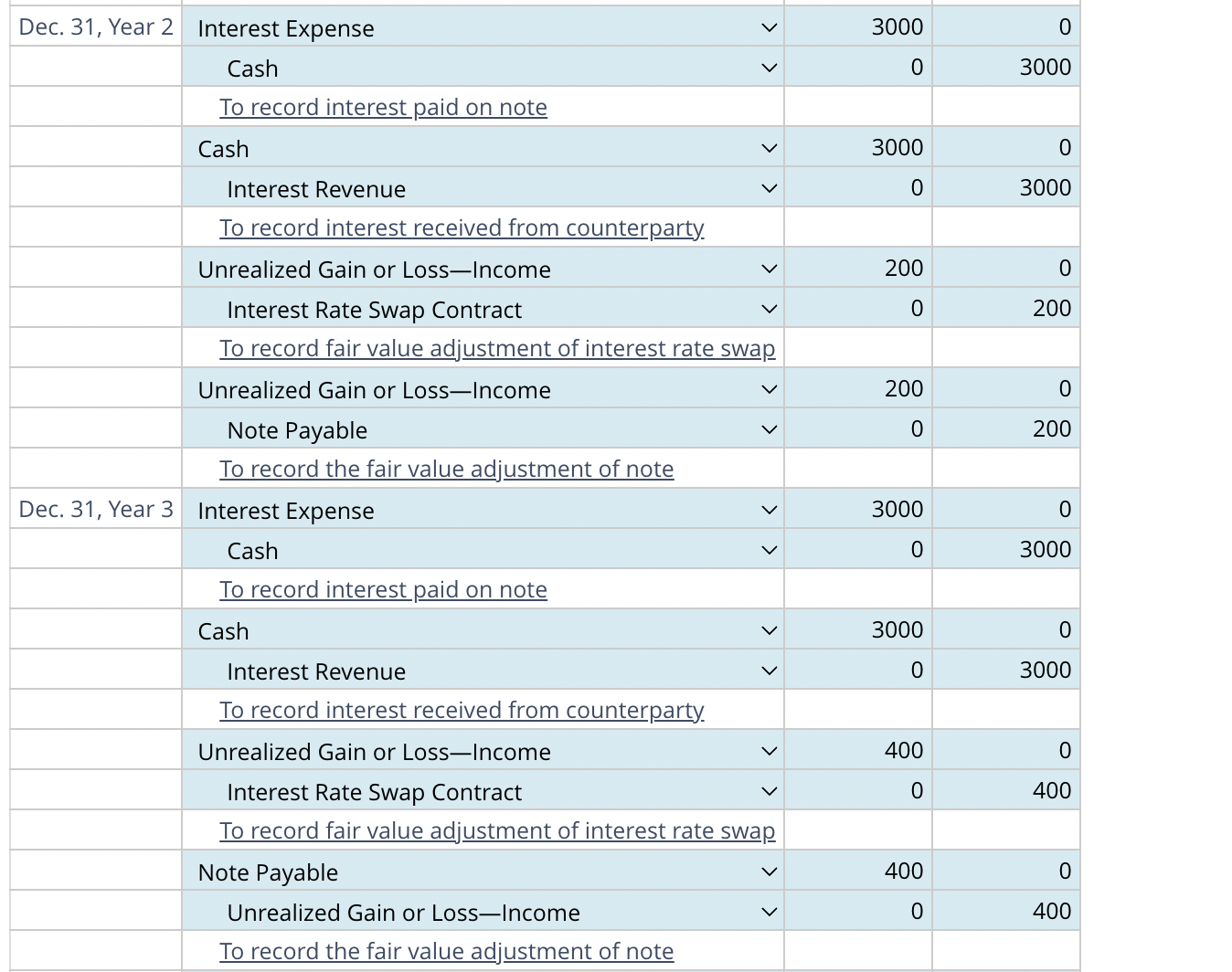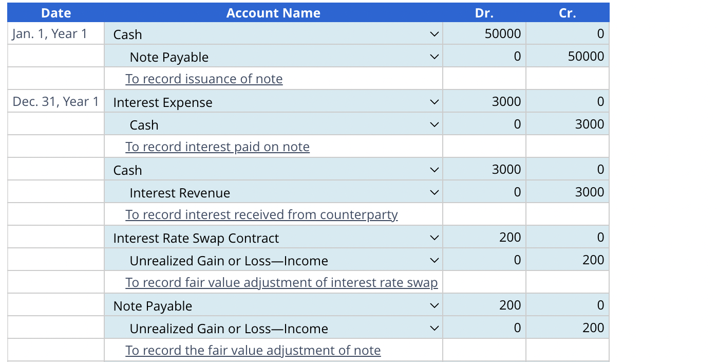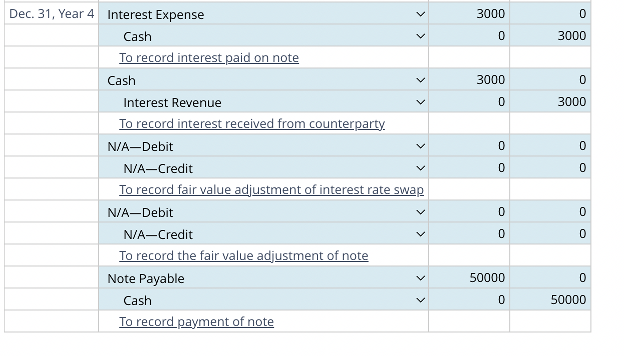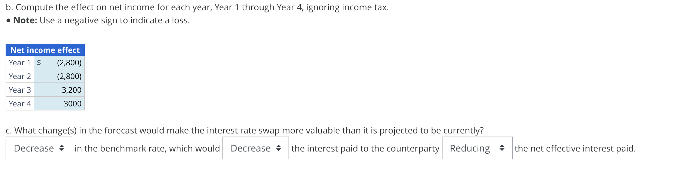 $50,000. The settlement date for the net cash payment is on December 31 of each year. The following table provides additional information related to the interest rate swap as forecasted over the next 4 years. \table[[,Dec. 31, Year 1,Dec. 31, Year 2,Dec. 31, Year 3,Dec. 31, Year 4],[Fair value: Interest rate swap,$200,$400,$0,$0],[Fair value: note payable,$50,200,$50,400,$50,000,$50,000],[Benchmark interest rate,4.2%,4.0%,5.2%,5.8%]] Required a. Record the required journal entries for Year 1, Year 2, Year 3, and Year 4 related to the note payable and interest rate swap agreement. Note: If a journal entry isn't required, select "N/A—Debit" and "N/A—Credit" as the account names and leave the Dr. and Cr. answers blank (zero). \table[[Date,Account Name,Dr.,Cr.],[Jan. 1, Year 1,Cash,50000,0],[Note Payable,0,50000],[To record issuance of note,,],[Dec. 31, Year 1,Interest Expense,3000,0],[Cash,0,3000],[To record interest paid on note,,],[Cash,3000,0],[Interest Revenue,0,3000],[To record interest received from counterparty.,,],[Interest Rate Swap Contract,200,0],[Unrealized Gain or Loss—Income,0,200],[To record fair value adjustment of interest rate swap,,],[Note Payable,200,0],[Unrealized Gain or Loss-Income,0,200],[To record the fair value adjustment of note,,]] \table[[Dec. 31, Year 4,Interest Expense,v,3000,0],[Cash,v,0,3000],[To record interest,,,],[Cash,v,3000,0],[Interest Revenue,v,0,3000],[To record interest,F,,],[N/A—Debit,v,0,0],[N/A—Credit,v,0,0],[To record fair valu,,,],[N/A—Debit,v,0,0],[N/A-Credit,v,0,0],[To record the fair,,,],[Note Payable,v,50000,0],[Cash,v,0,50000],[To reco,,,]]b. Compute the effect on net income for each year, Year 1 through Year 4, ignoring income tax. Note: Use a negative sign to indicate a loss. c. What change(s) in the forecast would make the interest rate swap more valuable than it is projected to be currently? Decrease