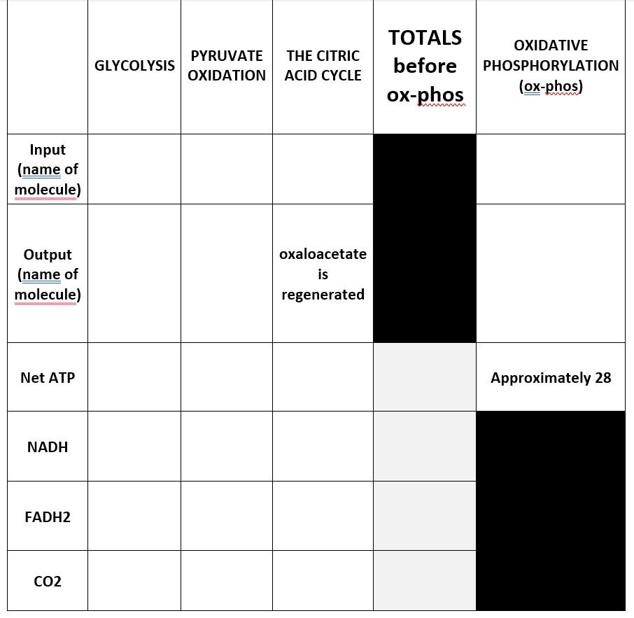 Please fill in this table with the input molecules, output molecules, and numbers of ATP, NADH, and FADH2 molecules produced per glucose at each stage of aerobic cellular respiration. Include as much detail as possible to help you recall this information.