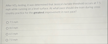 VO_(2)testing, it was determined that Jessica's lactate threshold occurs at 7.5 mph waile running on a level surface. At what pace should she train during cross country practice for the greatest improvement in race pace? 7.5 mph an man 6.5 mph 7.0 man