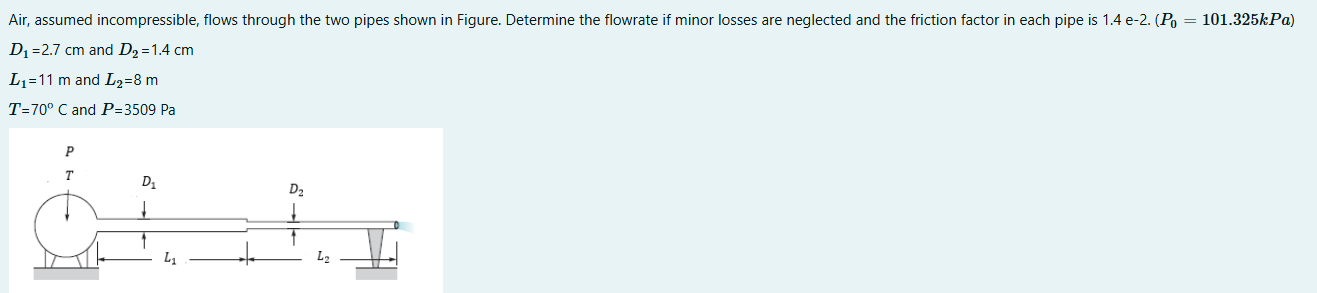 Air, assumed incompressible, flows through the two pipes shown in Figure. Determine the flowrate if minor losses are neglected and the friction factor in each pipe is 1.4e-2.(P_(0)=101.325kPa)