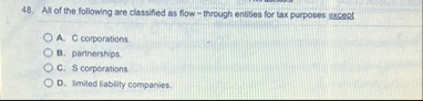 (Solved): All of the following are classified as flow - through entities for tax purposes uxcept