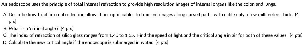 An endoscope uses the principle of total internal refraction to provide high resolution images of internal organs like the colon and lungs. A. Describe how total internal reflection allows fiber optic cables to transmit images along curved paths with cable only a few millimeters thick. (4 pts) B. What is a 'critical angle'? (4 pts) C. The index of refraction of silica glass ranges from 1.40 to 1.55 . Find the speed of light and the critical angle in air for both of these values. ( 4 pts ) D. Calculate the new critical angle if the endoscope is submerged in water. (4 pt5) Please Answer ALL questions.