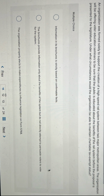 An organization was formed solely to support the creation of a high-speed rail system between two major metropolitan areas. The organization will be offering voter education seminars to be sure that the public is educated about the benefits of the rail system before the proposal is presented to the legislature. Under what circumstances would the organization be able to maintain charitable tax-exempt status? Multiple Choice Information in its brochures is strictly based on confirmable facts. The brochures provide information only about the benefits of the system but do not directly attempt to persuade voters to vote for the system: The organization properly elects to make expenditures to influence legislation on Form 5768. Prev 11 12 13 of 24 Next