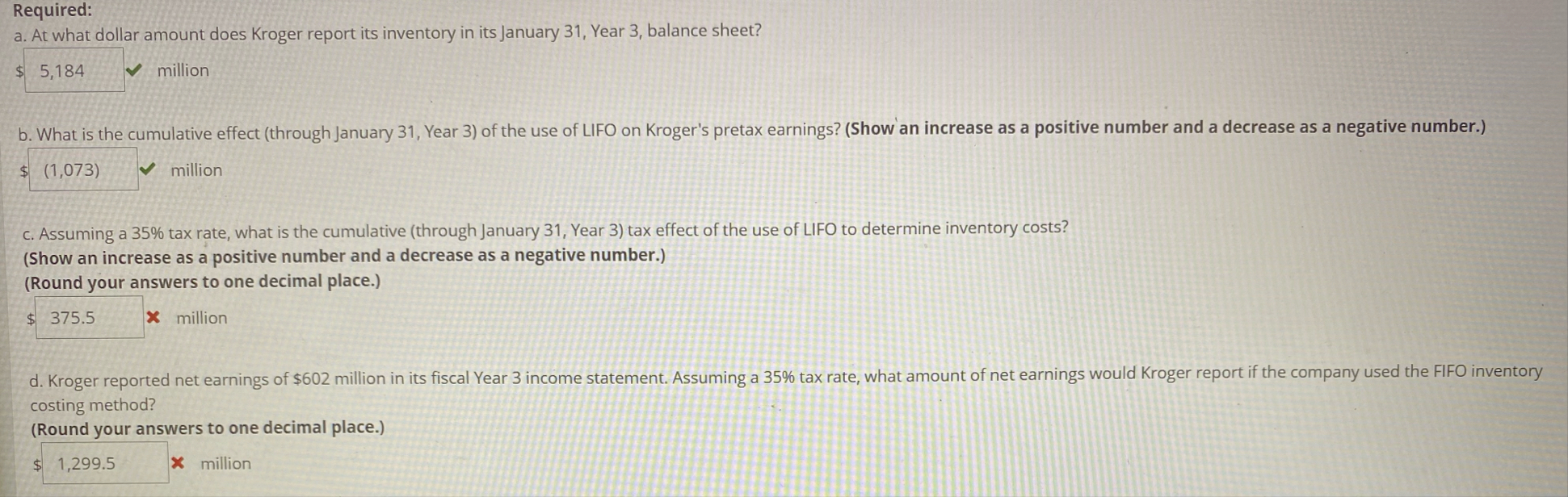 ?million b. What is the cumulative effect (through January 31, Year 3) of the use of LIFO on Kroger's pretax earnings? (Show an increase as a positive number and a decrease as a negative number.)