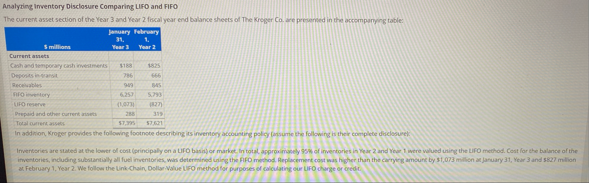 (1,073),(827)],[Prepaid and other current assets,288,319],[Total current assets,$7,395,$7,621]] In addition, Kroger provides the following footnote describing its inventory accounting policy (assume the following is their complete disclosure): Inventories are stated at the lower of cost (principally on a LIFO basis) or market. In total, approximately 95% of inventories in Year 2 and Year 1 were valued using the LIFO method. Cost for the balance of the inventories, including substantially all fuel inventories, was determined using the FIFO method. Replacement cost was higher than the carrying amount by