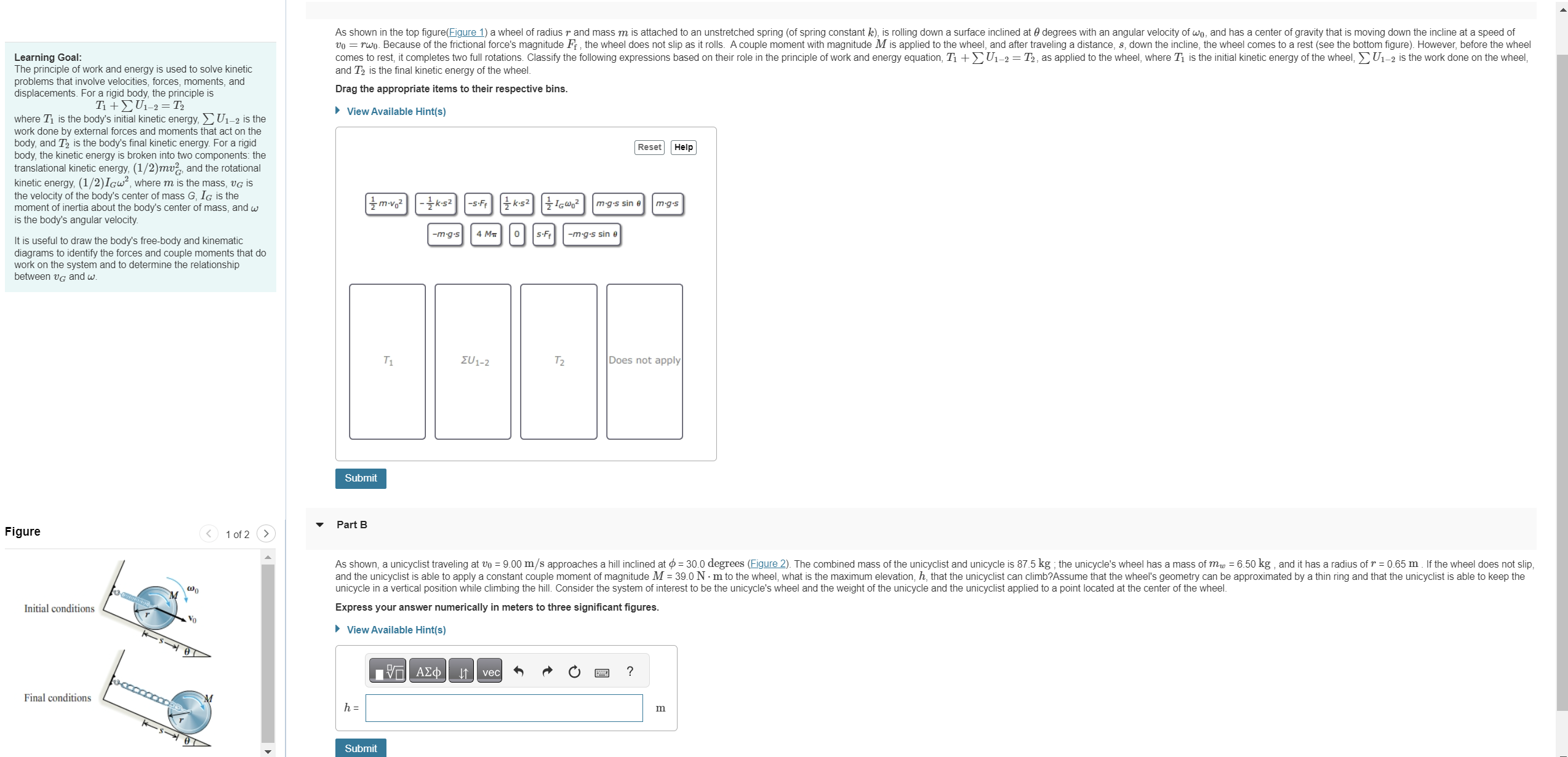 T_(2)is the final kinetic energy of the wheel Drag the appropriate items to their respective bins. View Available Hint(s) Part B unicycle in a vertical position while climbing the hill. Consider the system of interest to be the unicycle's wheel and the weight of the unicycle and the unicyclist applied to a point located at the center of the wheel. Express your answer numerically in meters to three significant figures. View Available Hint(s) ? 0 3