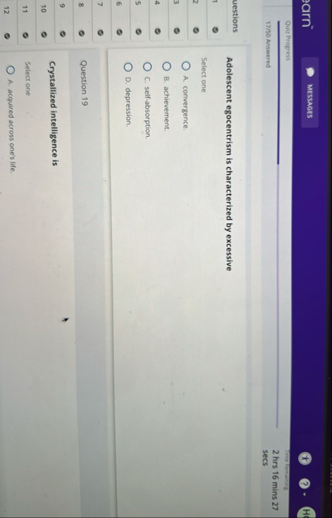 arn MESSAGES Quit Progress Timenemaining 2 hrs 16 mins 27 17/50 Answered secs Adolescent egocentrism is characterized by excessive Select one 2 A. convergence. 3 B. achievement. 4 C. self-absorption. 5 D. depression. 6 7 8 Question 19 9 Crystallized intelligence is 10 11 Select one 12