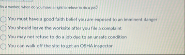As a worker, when do you have a right to refuse to do a job? You must have a good faith belief you are exposed to an imminent danger You should leave the worksite after you file a complaint You may not refuse to do a job due to an unsafe condition You can walk off the site to get an OSHA inspector