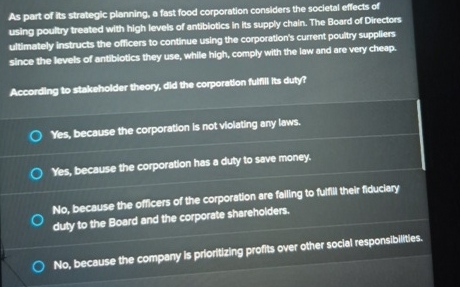 As part of its strategic planning, a fast food corporation considers the societal effects of using poultry treated with high tevels of antiblotics in ths supply chain. The Board of Directors ultimately instructs the ofilcers to continue using the corporation's current poutty suppliers since the levels of antiblotics they use, while high, comply with the law and are very cheap. According to strebcholder theory, did the corporation futrill its dub?