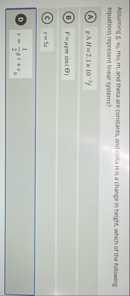 , and theta are constants, and delta H is a change in height, which of the following equations represent linear systems?