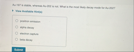 (Solved): Au-197 is stable, whereas Au-202 is not. What is the most likely decay mode for Au-202?