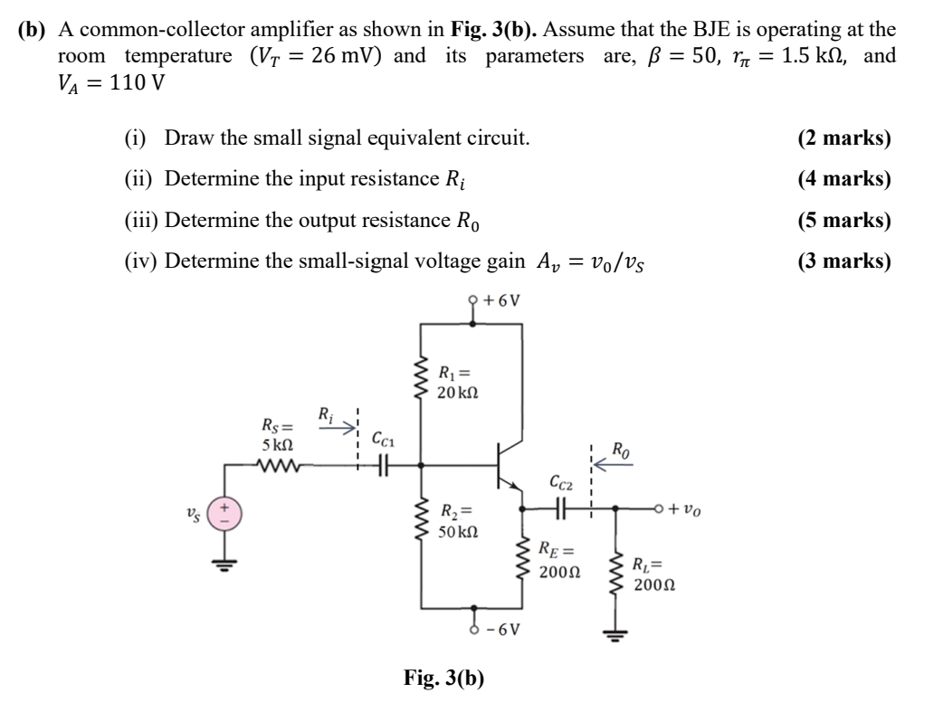 (b) A common-collector amplifier as shown in Fig. 3(b). Assume that the BJE is operating at the room temperature (