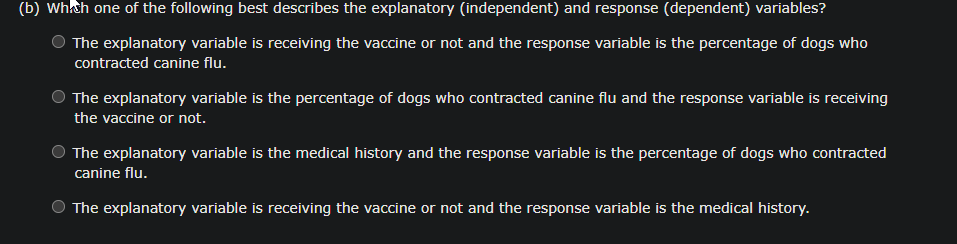(b) Whish one of the following best describes the explanatory (independent) and response (dependent) variables?The explanatory variable is receiving the vaccine or not and the response variable is the percentage of dogs who contracted canine flu.The explanatory variable is the percentage of dogs who contracted canine flu and the response variable is receiving the vaccine or not.The explanatory variable is the medical history and the response variable is the percentage of dogs who contracted canine flu.The explanatory variable is receiving the vaccine or not and the response variable is the medical history.