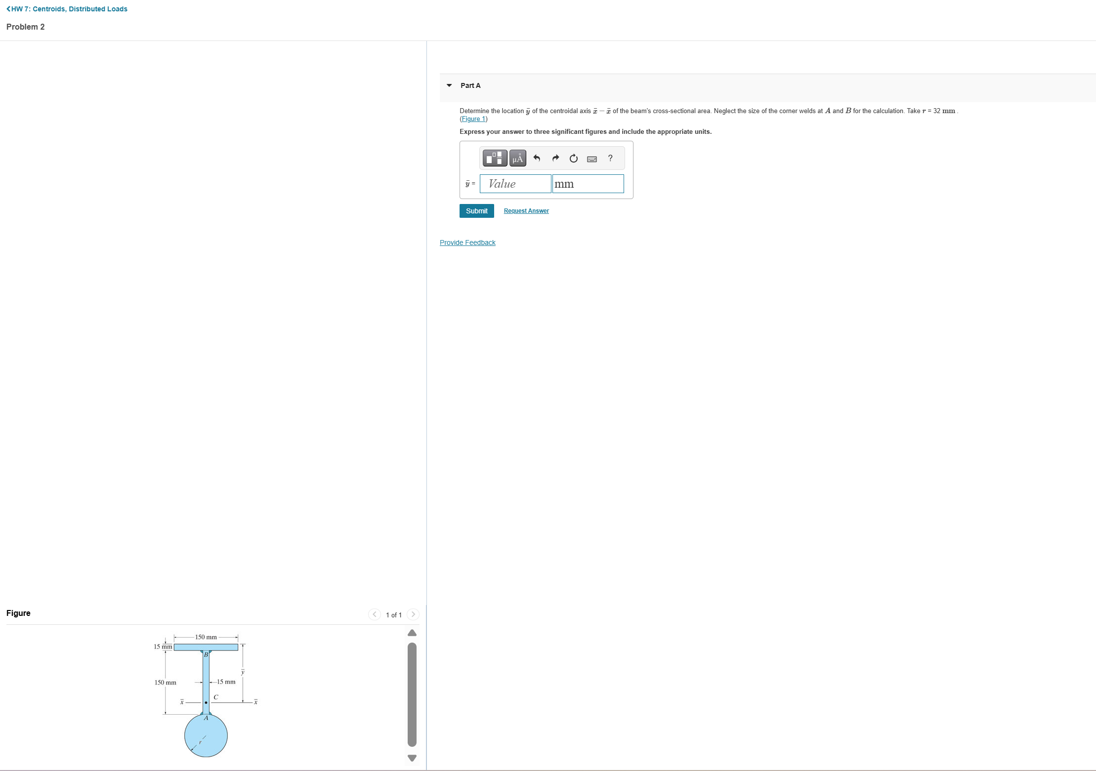\bar{x} -\bar{x} ABr=32mm()/(bar) (y)=()/(bar) (y) of the centroidal axis \bar{x} -\bar{x} of the beam's cross-sectional area. Neglect the size of the corner welds at A and B for the calculation. Take r=32mm. (Figure 1)