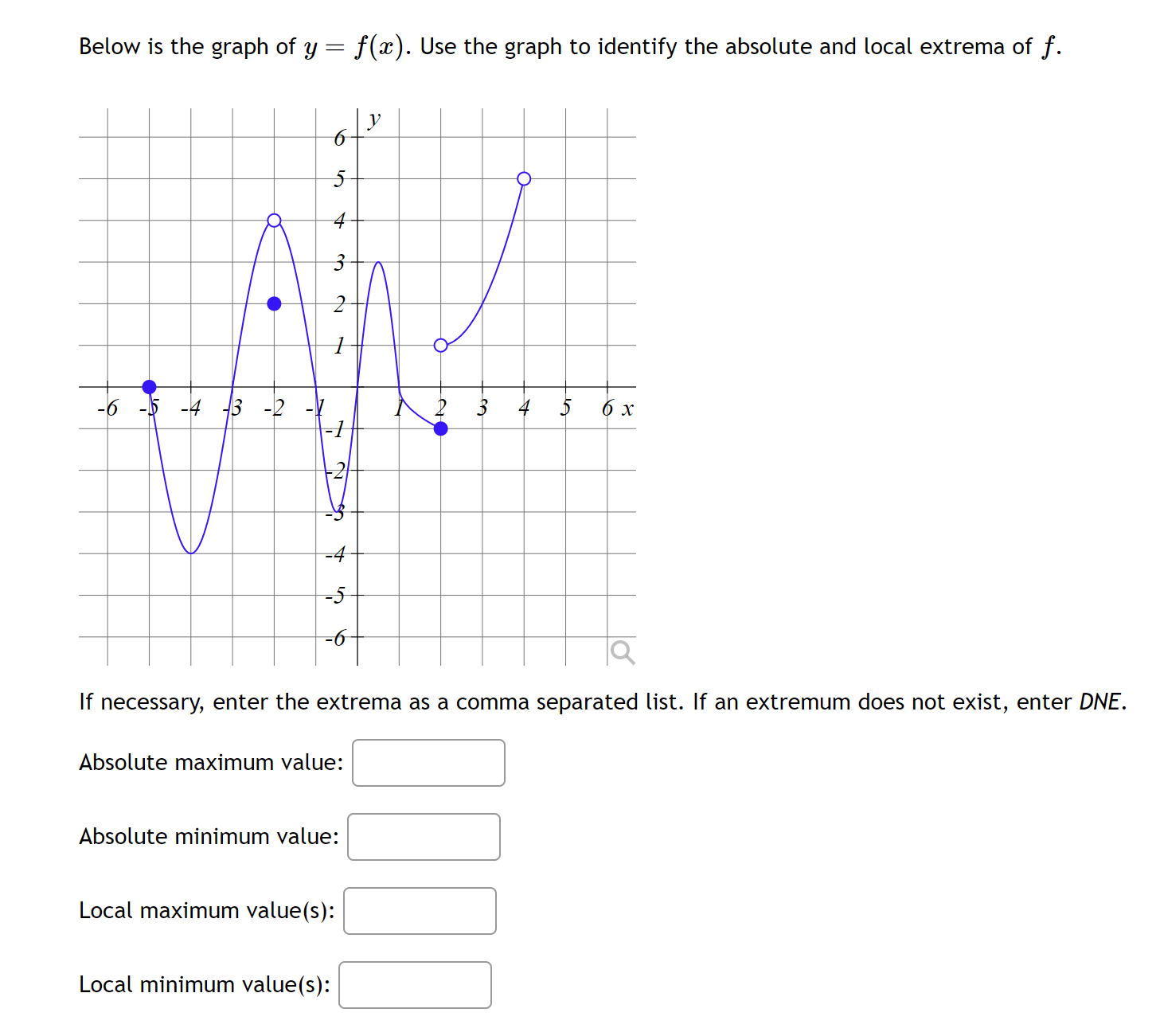 f. If necessary, enter the extrema as a comma separated list. If an extremum does not exist, enter DNE. Absolute maximum value: Absolute minimum value: Local maximum value(s): Local minimum value(s):