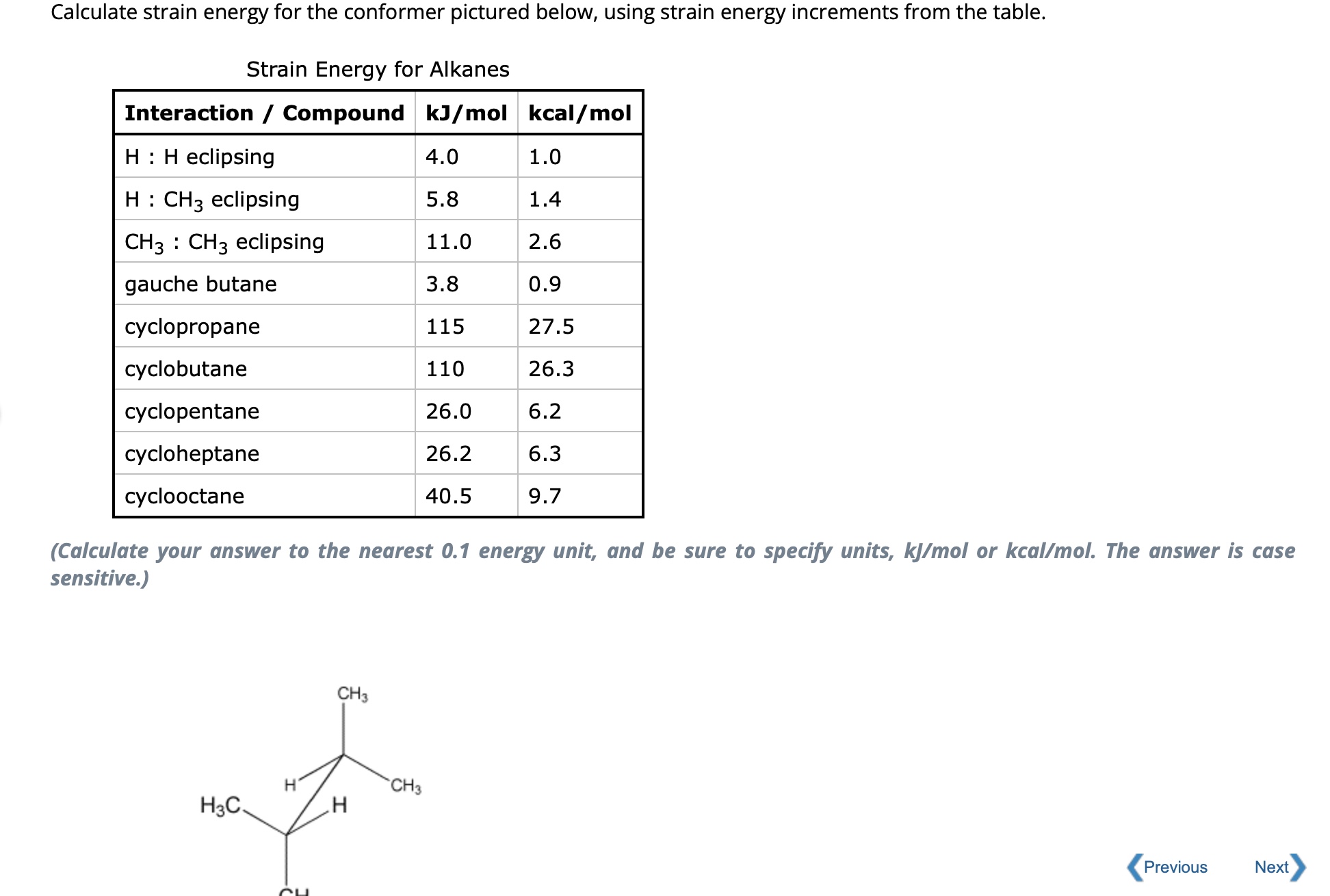 Calculate strain energy for the conformer pictured below, using strain energy increments from the table. Strain Energy for Alkanes (Calculate your answer to the nearest 0.1 energy unit, and be sure to specify units,