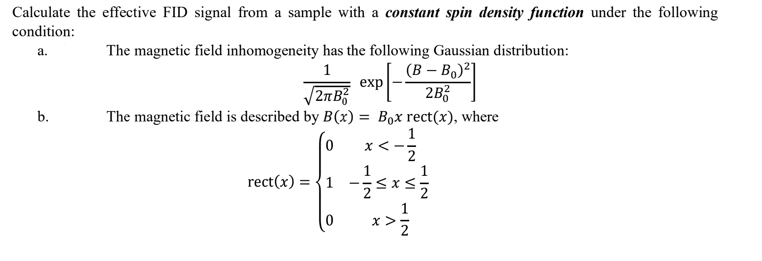 Calculate the effective FID signal from a sample with a constant spin density function under the following condition: a. The magnetic field inhomogeneity has the following Gaussian distribution: