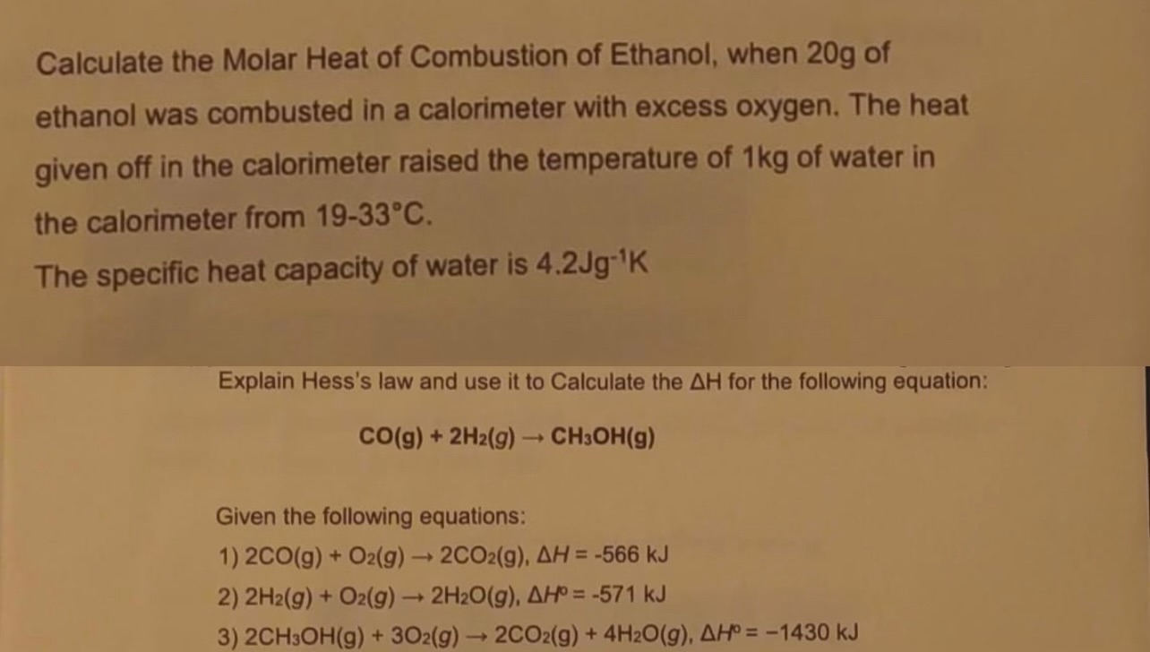 Calculate the Molar Heat of Combustion of Ethanol, when 20 g of ethanol was combusted in a calorimeter with excess oxygen. The heat given off in the calorimeter raised the temperature of 1 kg of water in the calorimeter from