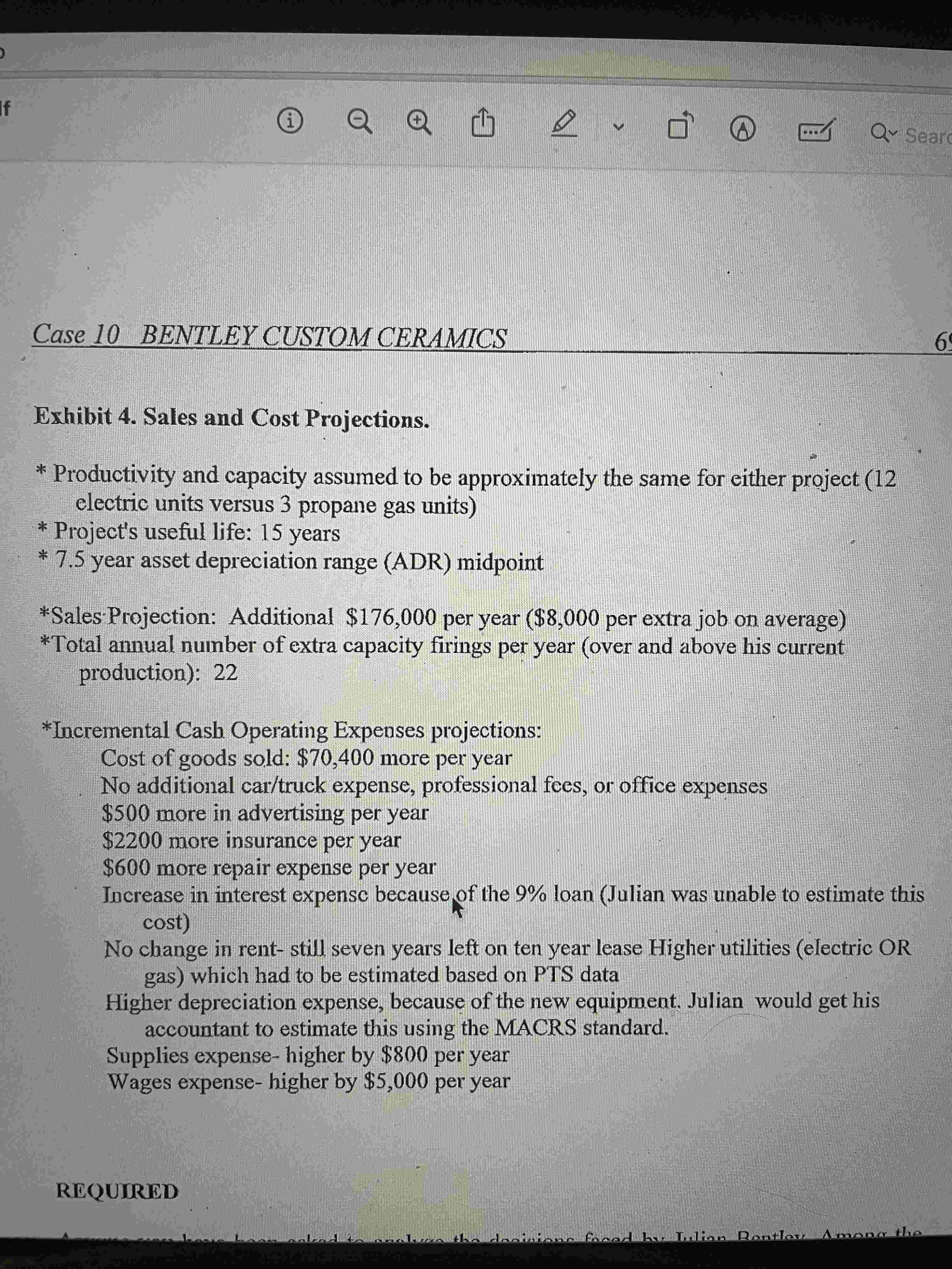 Calculate the net operating cash flows for both projects, using appropriate depreciation schedules (each group will need to find the appropriate schedule to use. Include that information in the group presentation). Consider that the case provided your group was the Best of the Best scenario. Consider that a More Realistic scenario would be for only 19 additional firings, but the revenue would be $7,750 . The other expenses ( except depreciation) would increase by 2%. A Bad case would be only 14 additional firings, the price drops to $7,650, but in addition, the kilns do not handle the mass production as well and the waste loss increases the Cost of goods sold by 8%. The worst case scenario includes all of the Bad Case, but the price of gas increases 10%, and insurance increases by 2% of the purchase price of the kilns per year.