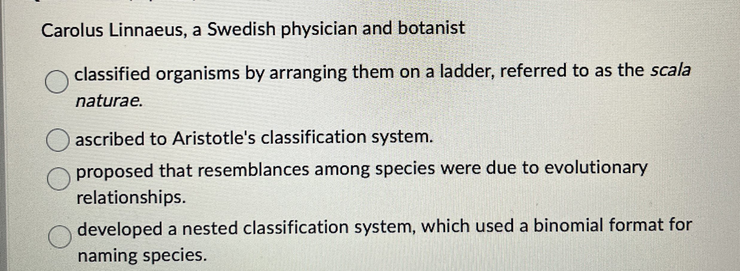 Carolus Linnaeus, a Swedish physician and botanist classified organisms by arranging them on a ladder, referred to as the scala naturae. ascribed to Aristotle's classification system. proposed that resemblances among species were due to evolutionary relationships. developed a nested classification system, which used a binomial format for naming species.