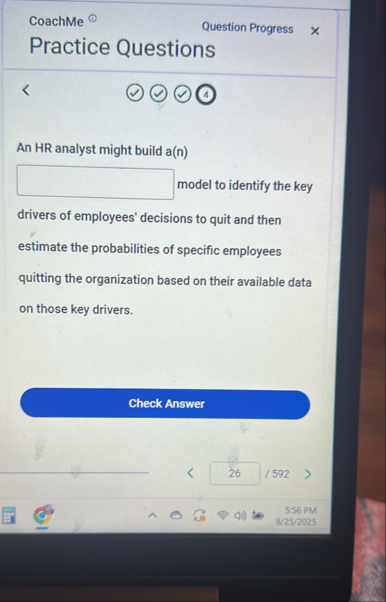 CoachMe Question Progress Practice Questions (4) An HR analyst might build a(n)