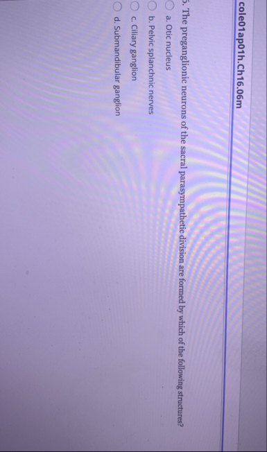 cole01ap01h.Ch16.06m 5. The preganglionic neurons of the sacral parasympathetic division are formed by which of the following structures? a. Otic nucleus b. Pelvic splanchnic nerves c. Ciliary ganglion d. Submandibular ganglion