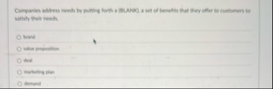 (Solved): Companies address needs by putting forth a (BLANK, a set of benefits that they offer to customers to ...