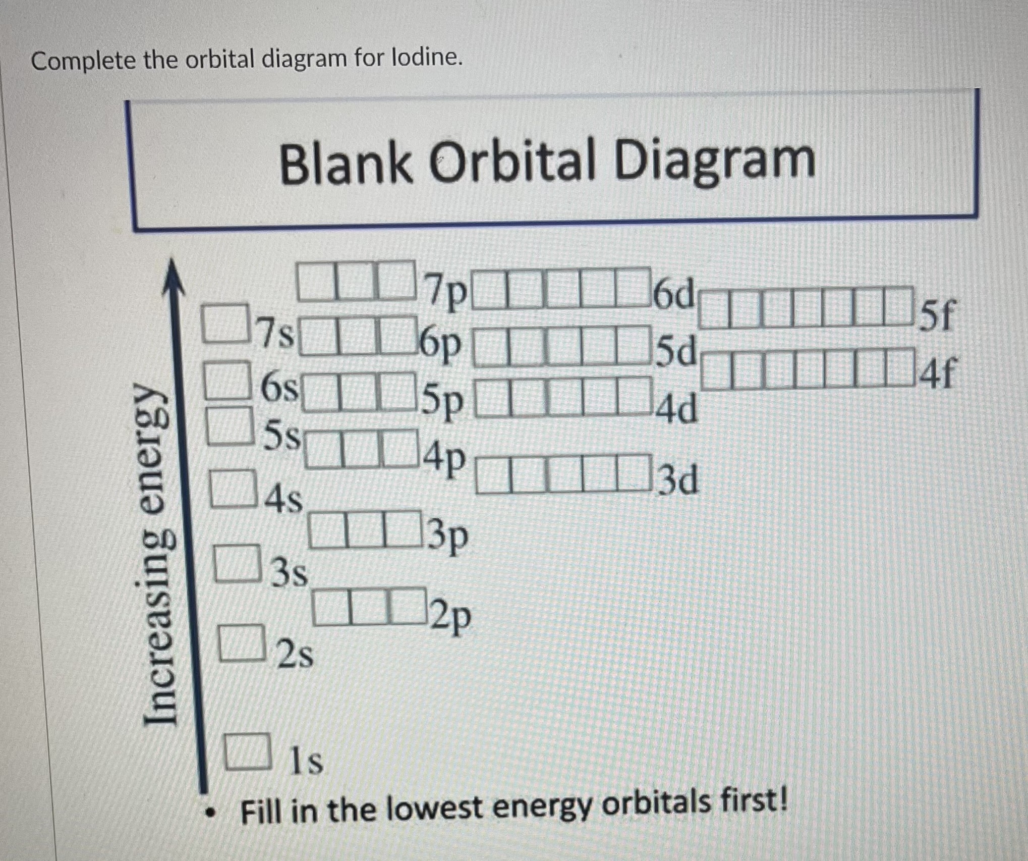 Complete the orbital diagram for lodine. Blank Orbital Diagram please answer very clearly and fill out the diagram and please show work