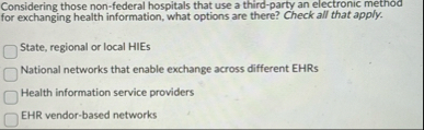 Considering those non-federal hospitals that use a third-party an electronic method for exchanging health information, what options are there? Check all that apply. State, regional or local HIEs National networks that enable exchange across different EHRs Health information service providers EHR vendor-based networks