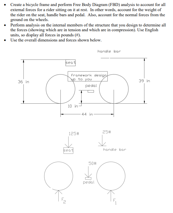 - Create a bicycle frame and perform Free Body Diagram (FBD) analysis to account for all external forces for a rider sitting on it at rest. In other words, account for the weight of the rider on the seat, handle bars and pedal. Also, account for the normal forces from the ground on the wheels. - Perform analysis on the internal members of the structure that you design to determine all the forces (showing which are in tension and which are in compression). Use English units, so display all forces in pounds (\#). - Use the overall dimensions and forces shown below. handle bar