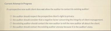 Current Attempt in Proyress If a prospective new audit client does not allow the auditor to contact its existing auditor: the auditor should respect the prospective client's right to privacy. the auditor should consider that a negative factor concerning the infegrity of client management. the ealsing auditor should contact the new auditor to tell the new auditor all about the client. the auditor should contact the existing auditor anyway because it is the auditor's duty.