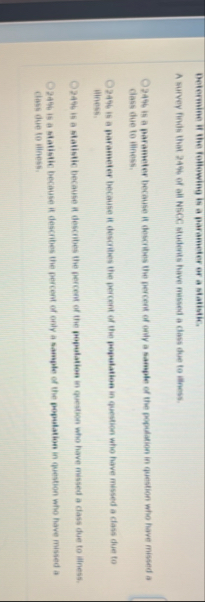 Deformine if the following is a paramefer or a statistic. A survey finds that 2496 of all Niscc, sudents have massed a class due to illness. 2496 is a parameter because if describes the percent of only a sample of the population in question who have missed a dass due to iliness. 2446 is a parameter because if describes the percent of the population in question who have missed a class due to Miness. 2446 is a statistic because it describes the gercent of the population in question who have mussed a dass due to diness. 24% is a statistic because if describes the percent of orily a sample of the peppolation in question who have missed a ???s due to iliness.