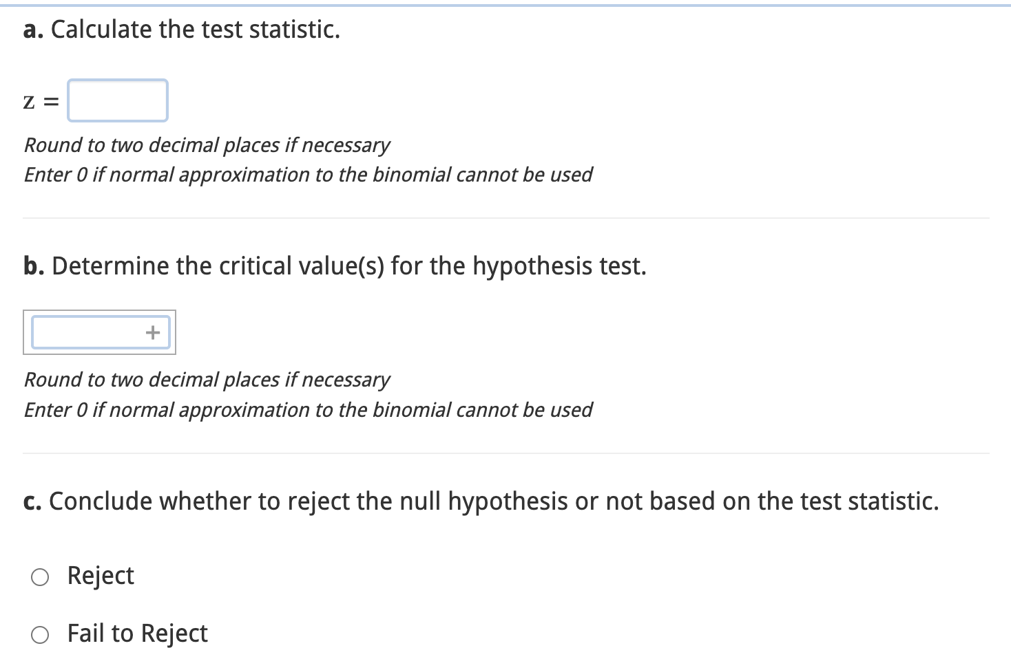 Z=Round to two decimal places if necessary Enter 0 if normal approximation to the binomial cannot be used b. Determine the critical value(s) for the hypothesis test. Round to two decimal places if necessary Enter 0 if normal approximation to the binomial cannot be used c. Conclude whether to reject the null hypothesis or not based on the test statistic. Reject Fail to Reject
