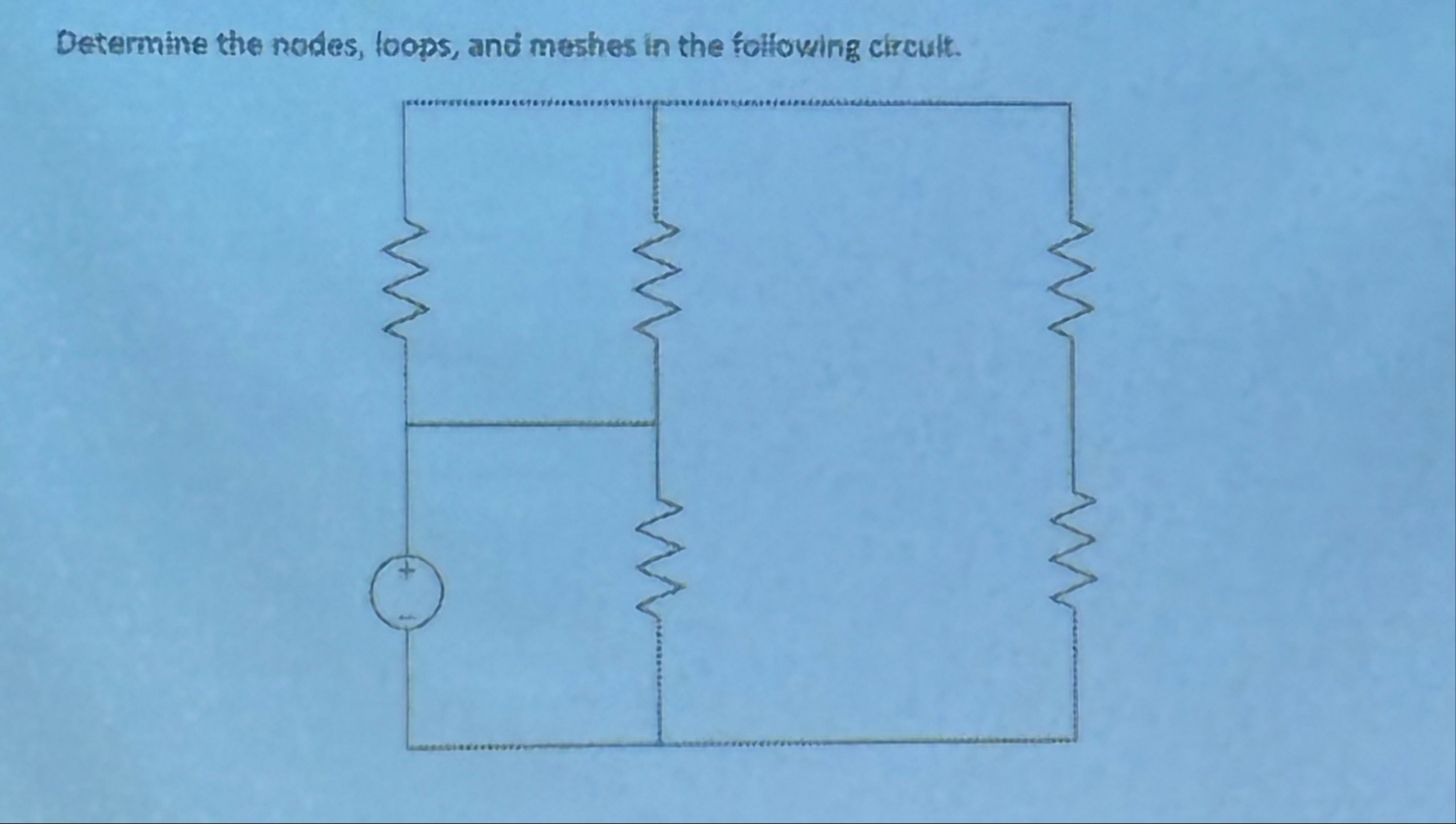Determine the nodes, loops, and meshes in the following circult. Circle and label them and then write a wuick explanation for why each one is where it is.