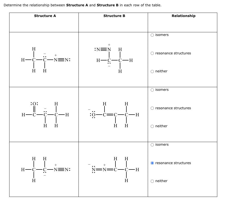 (Solved): Determine the relationship between Structure A and Structure B in each row of the table. ...