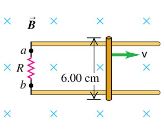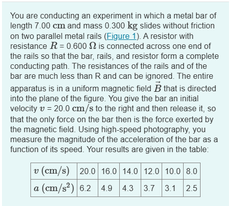 Determine the slope of the best-fit straight line for the data. You are conducting an experiment in which a metal bar of length 7.00 cm and mass 0.300 kg slides without friction on two parallel metal rails (Figure 1). A resistor with resistance \( R=0.600 \Omega \) is connected across one end of the rails so that the bar, rails, and resistor form a complete conducting path. The resistances of the rails and of the bar are much less than R and can be ignored. The entire apparatus is in a uniform magnetic field \( \vec{B} \) that is directed into the plane of the figure. You give the bar an initial velocity \( v=20.0 \mathrm{~cm} / \mathrm{s} \) to the right and then release it, so that the only force on the bar then is the force exerted by the magnetic field. Using high-speed photography, you measure the magnitude of the acceleration of the bar as a function of its speed. Your results are given in the table: