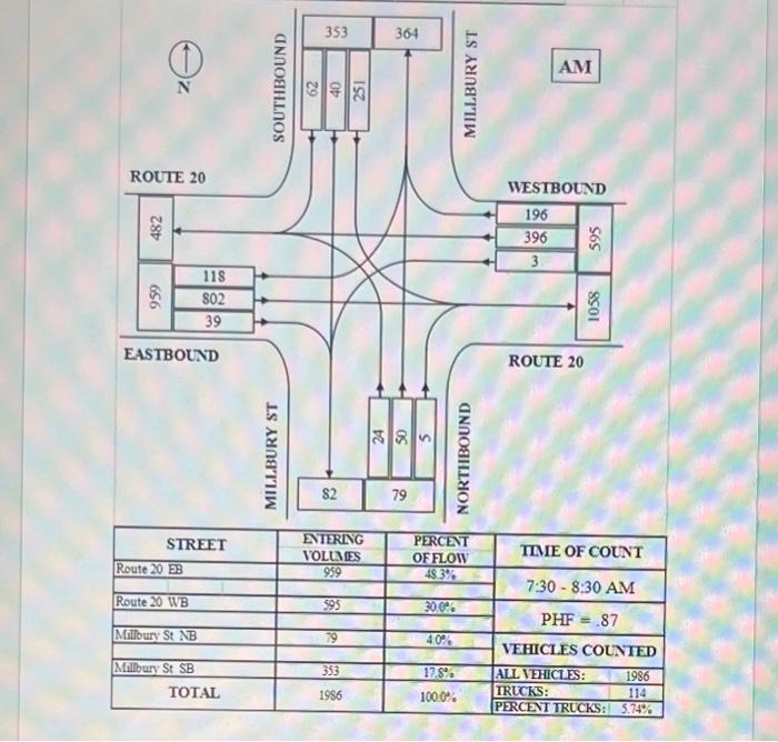 Develop a Signal Timing Plan for the intersection of Route 20 with Millbury Street in Auburn for the AM peak hour. A turning movement count has been provided on the next page. In addition, you can assume the following: - Route 20 has two lanes in each direction (this will impact the crossing width) - Route 20 approach speeds are 50MPH - Millbury Street approach speeds are 30MPH - Xc=0.95 - Grade =0 on all approaches The timing plan should include: - the number of phases - total Cycle length - yellow times for each phase - actual green times for each phase, and - movements for each phase. A table similar to the one provided in the Class PowerPoint would be preferred. Be sure to include all calculations.