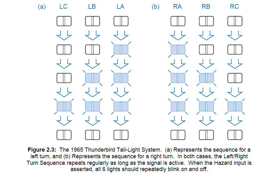 Develop your 555 Timer to create a 1 Hz clock signal with a Duty Cycle as close to 50% as possible. Determine the required resistor and capacitor values necessary to implement your design based upon the components in your lab kit. 4. Examine the specification sheet for the 74LS14 Schmitt Trigger Inverter. Draw a circuit diagram (with all necessary pinouts) that implements your 555 Timer and applies the Output of the Timer to the input of the 74LS14. Since the 7414 inverts your signal, use 2 inverters in series to buffer the clock. 5. After examining Figure 2.3, quantify the number of states necessary for the state machine, as well as the number of inputs and outputs to the system. Categorize the system as Mealy or Moore, again by observation. 6. Develop a State Diagram. 7. From the State Diagram, compute the (minimum) number of Flip-Flops required. 8. Assign each of the observable external states to an internal machine state (a unique Flip-Flop output combination). Although there are procedures for optimizing this assignment, for this exercise you may assign them arbitrarily. Page 5 of 6 9. Verify the State Diagram with your Instructor before proceeding any further. 4. LAB ASSIGNMENT 4.1 Synchronous State Machine Implementation 1. Once your State Diagram has been verified by your Instructor, produce a Next- State Table. Ensure that you design your machine to be self-starting, such that any used states have a valid and reasonable next state. As in lecture, the left- hand side of your Next State Table should possess the same number of columns as the Sum of the Present State Variables (Q0, Q1, etc.) and the number of inputs. The right-hand side of your Next State Table should possess the same number of columns as the Sum of the Next State Variables (Q0, Q1, etc.). 2. Assuming D Flip-Flops are used to create the memory cells, develop the Sum- of-Product Expressions (SOP) necessary to implement the Input Forming Logic to each of the Flip-Flops. The Input Variables used for your Input Forming Logic should include the external Inputs (Left, Right, and Hazard) as well as the Q/Q* outputs from each of the Flip-Flops, as necessary. The outputs for the IFL are the D inputs to the Flip-Flops. 3. Minimize the IFL SOP expressions using K-Maps to simplify the logic needed to implement the Input Forming Logic. 4. Develop the necessary Output Forming Logic from the output of your States to drive 6 LEDs. Minimize the expressions, as necessary. 5. Examine the ATMEL ATF750C Specification Sheet, ATMEL WinCUPL User’s Manual, and WinCUPL Tutorial to determine how to create the necessary source code to implement your Synchronous State Machine. 6. Compile your source code to create a JEDEC output file, which can then be used to program the ATMEL ATF750C using the ATEMEL Device Programmer. When programming your devices, be sure to use the anti-static wrist band to ground yourself, since the CMOS chips are easily damaged by static electricity. 7. Develop a Complete Circuit Diagram (with full pinouts for each chip) for your Synchronous State Machine design. 8. Build and test your system, using your circuit diagram as a guide. Note that the final output of your Synchronous State Machine should drive 6 LEDs to emulate the Tail-Light Section of the 1965 Thunderbird. Use switches for the Boolean Page 6 of 6 Inputs (LEFT, RIGHT, HAZARD), and the output of the 555 Timer (buffered by the 7414 Inverters) as your Input Clock. 9. Demonstrate your working circuit to your instructor. 10. Document your entire design process.