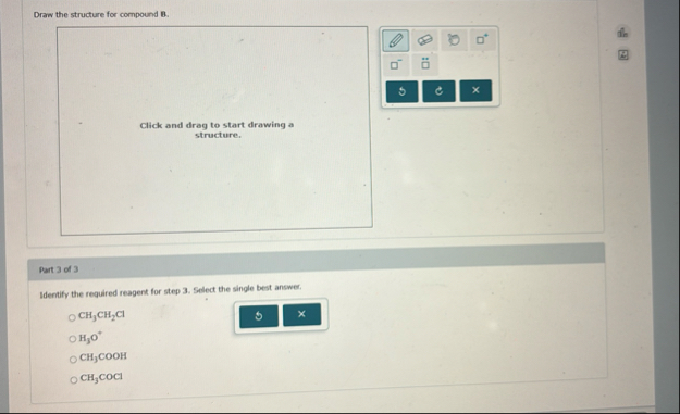 ?Click and drag to start drawing a structure.Draw the structure for compound B. Part 3 of 3 Identify the required reagent for step 3. Select the single best answer.