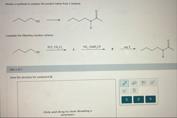 Devise a synthesis to prepare the product below from 1-butanol. Complete the following reaction scheme: Part 1 of 3 Draw the structure for compound A .