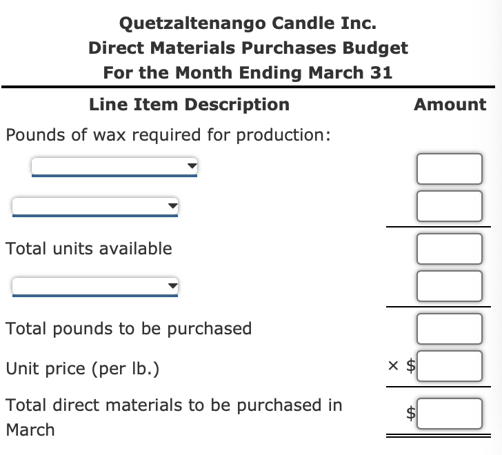 Direct materials purchases budget Quetzaltenango Candle Inc. budgeted production of 785,000 candles for March. Wax is required to produce a candle. Assume 10 ounces of wax is required for each candle. The estimated March 1 wax inventory is 16,700 pounds. The desired March 31 wax inventory is 12,900 pounds. If candle wax costs $1.50 per pound, determine the direct materials purchases budget for March. (One pound = 16 ounces.) Round all computed answers to the nearest whole number. For those boxes in which you must enter subtracted or negative numbers use a minus sign.Quetzaltenango Candle Inc. Direct Materials Purchases Budget For the Month Ending March 31 Line Item Description Amount Pounds of wax required for production: