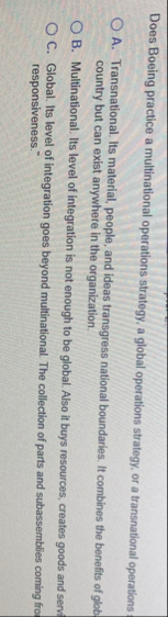 Does Boeing practice a multinational operations strategy, a global operations strategy, or a transnational operations A. Transnational. Its material, people, and ideas transgress national boundaries. It combines the benefits of glob country but can exist anywhere in the organization. B. Multinational. Its level of integration is not enough to be global. Also it buys resources, creates goods and sent C. Global. Its level of integration goes beyond multinational. The collection of parts and subassemblies coming from responsiveness."