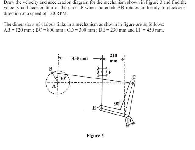Draw the velocity and acceleration diagram for the mechanism shown in Figure 3 and find the velocity and acceleration of the slider