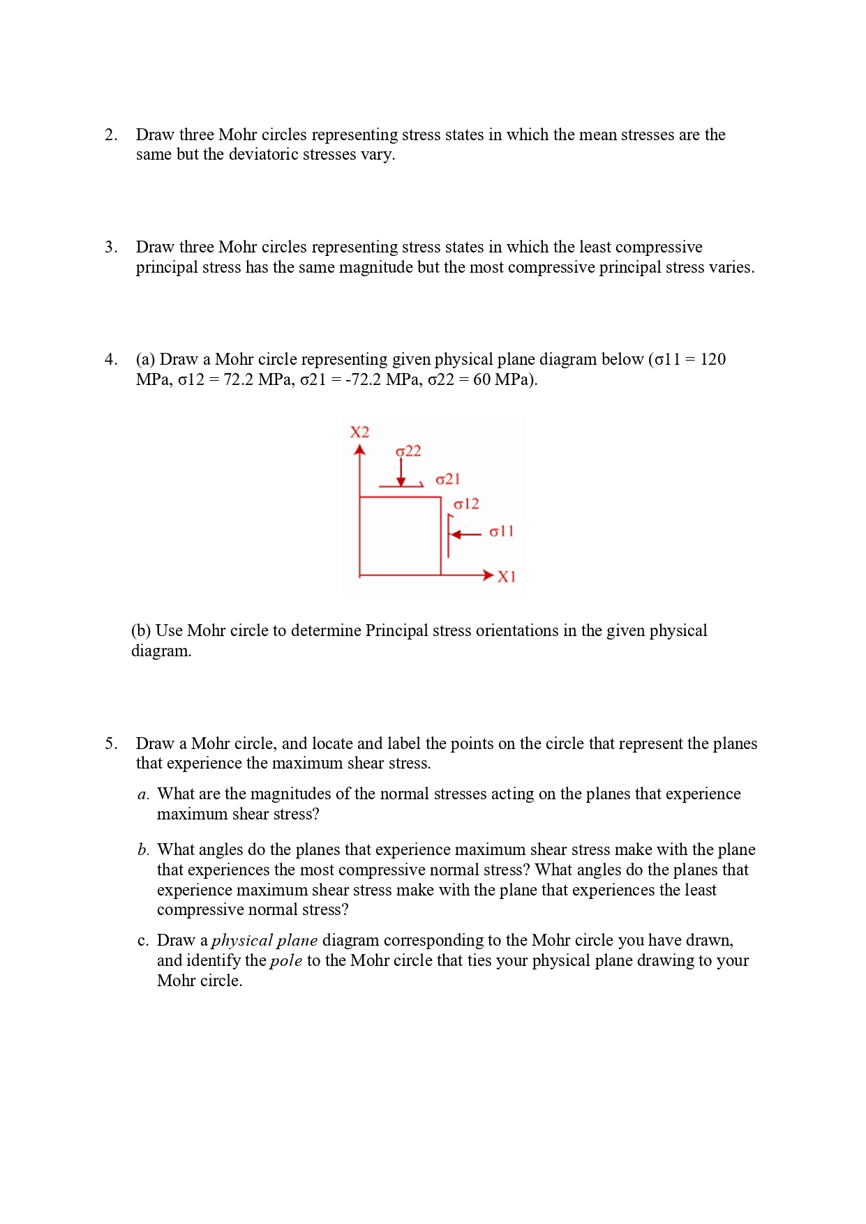 Draw three Mohr circles representing stress states in which the mean stresses are the same but the deviatoric stresses vary. Draw three Mohr circles representing stress states in which the least compressive principal stress has the same magnitude but the most compressive principal stress varies. (a) Draw a Mohr circle representing given physical plane diagram below (