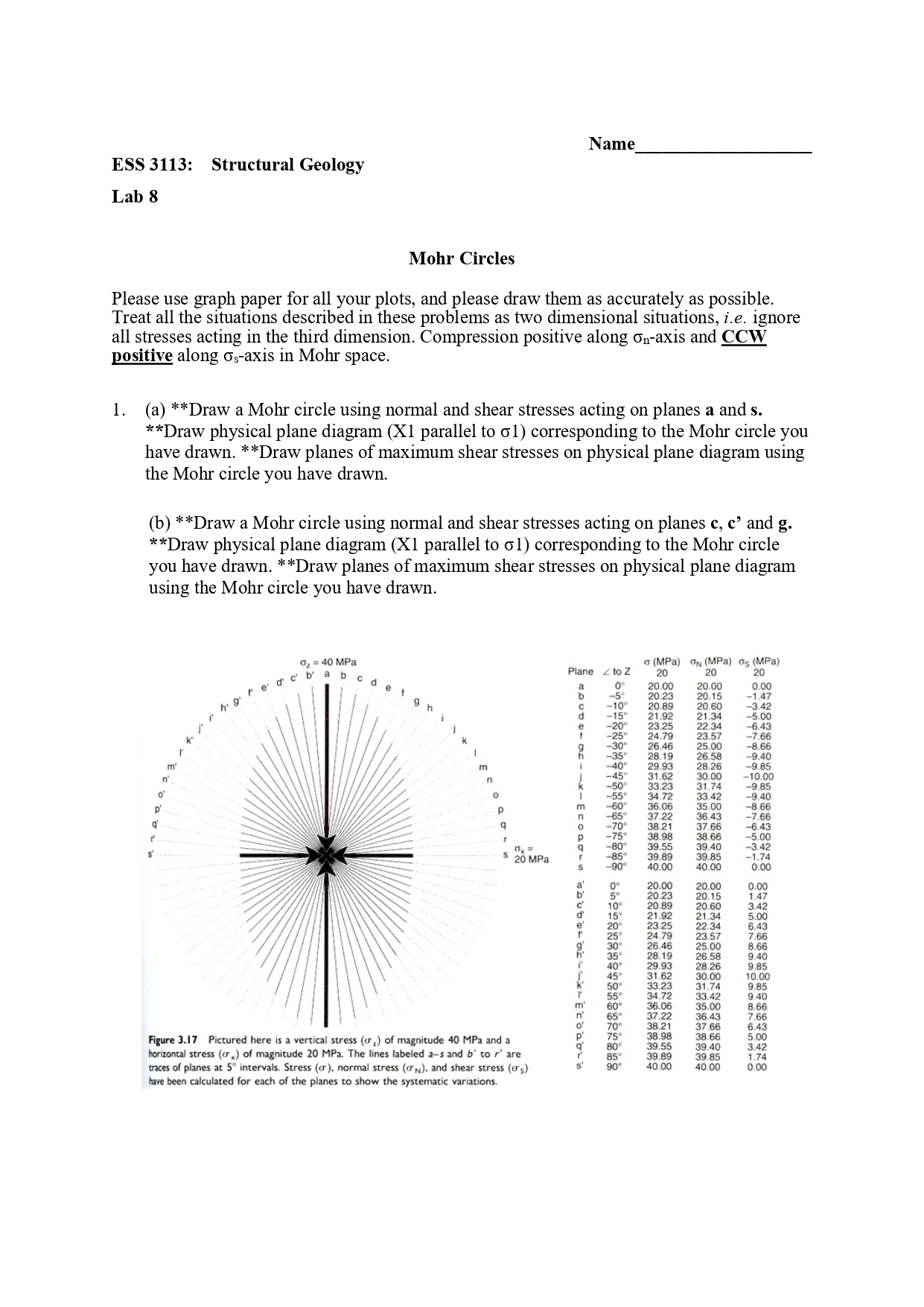 60\deg to the left. Imagine now that we place a s ESS 3113: Structural Geology Lab 8 Mohr Circles Please use graph paper for all your plots, and please draw them as accurately as possible. Treat all the situations described in these problems as two dimensional situations, i.e. ignore all stresses acting in the third dimension. Compression positive along