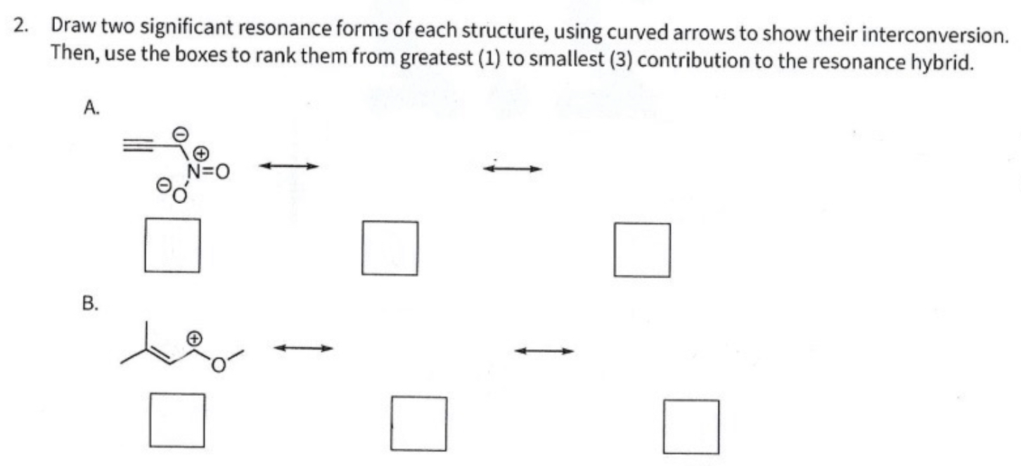 Draw two significant resonance forms of each structure, using curved arrows to show their interconversion. Then, use the boxes to rank them from greatest (1) to smallest (3) contribution to the resonance hybrid. A. B.