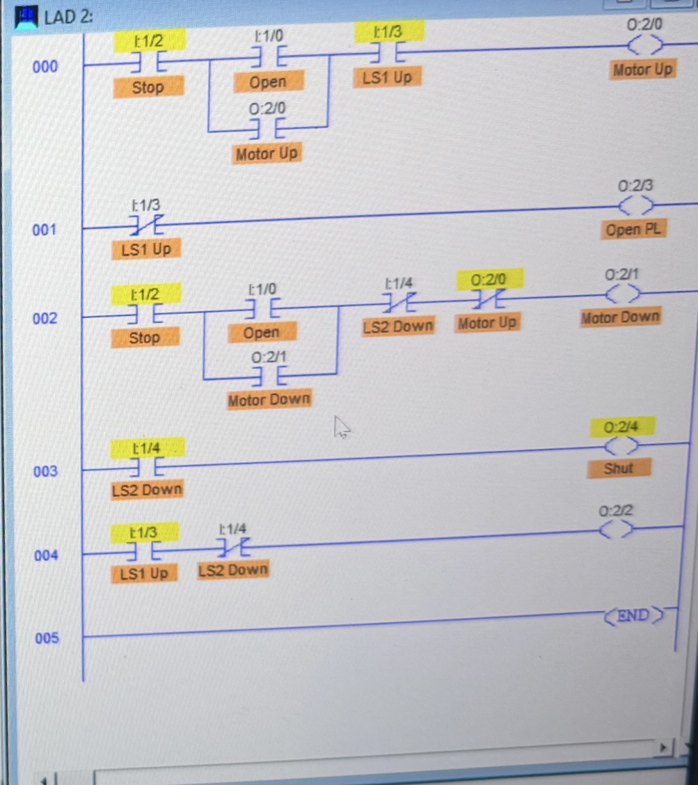 (Electrical Engineering) On LogixPro 500 Make this ladder diagram of a garage door which can open and close with same button, change it so it also can stop with only one button ((I:1/0)Open, Close, Stop)