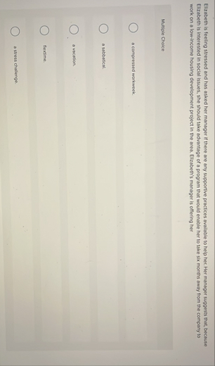 Elizabeth is feeling stressed and has asked her manager if there are any supportive practices available to help her. Her manager suggests that, because Eilzabeth is interested in social issues, she should take advantage of a program that would enable her to take sik months away from the company to work on a low-income housing development project in the area. Elizabeth's manager is offering her Multiple Choice a compressed workweek. a sabbatical. a vacation. fextime. a stress challenge.